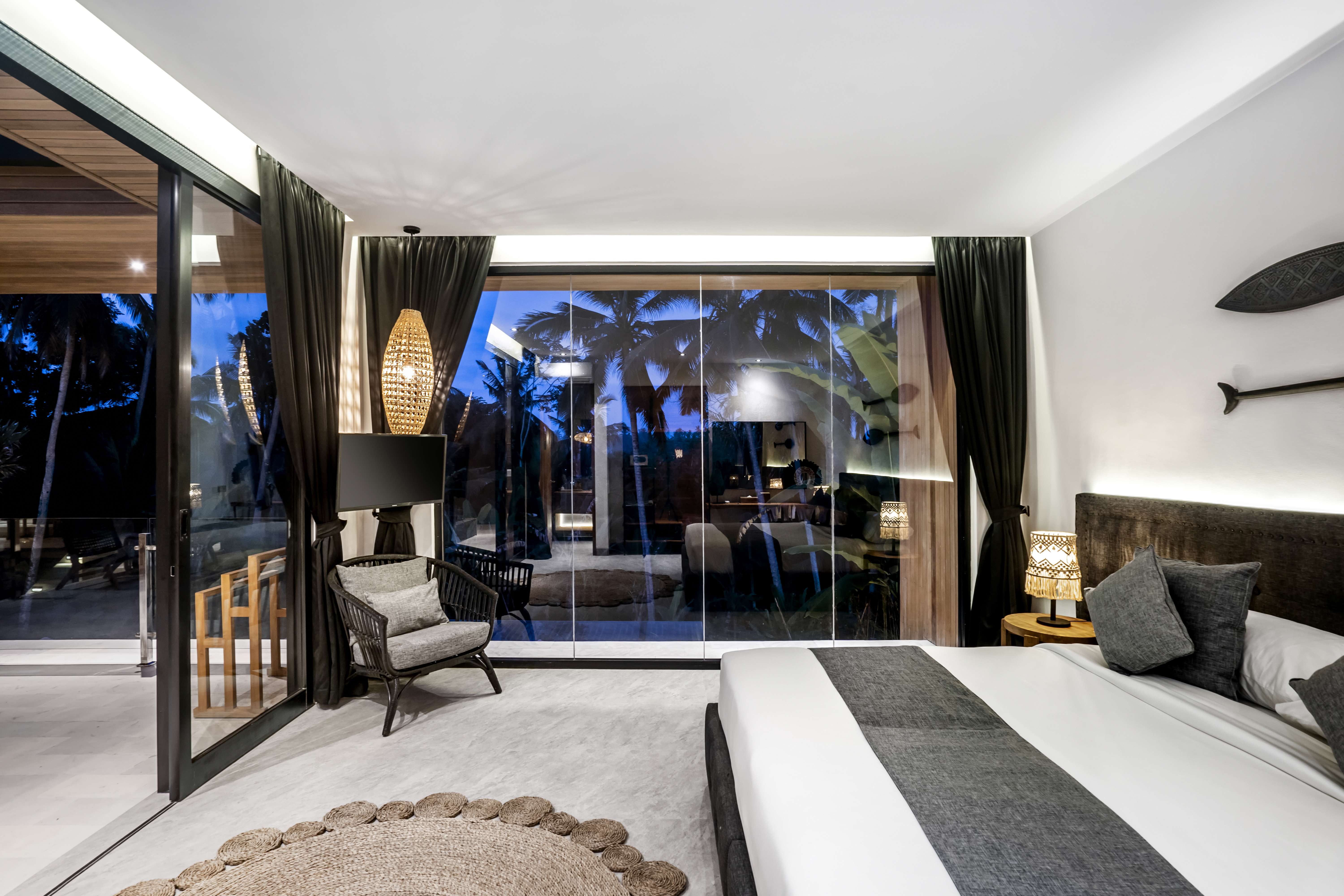 Kitchen, dining and lounge area are separated from the rooms and offer a view over the pool and nature. Large sliding glass doors can be opened at any time and let a nice breeze in the large rooms. The dining table fits comfortably 8 people and the fully equipped kitchen offers all you need to prepare some food and drinks for everyone. The sofa area is facing the beautiful view and consists of a large and comfy couch as well as two stylish stools. And if you wish, you can jump straight from here in the refreshing pool!